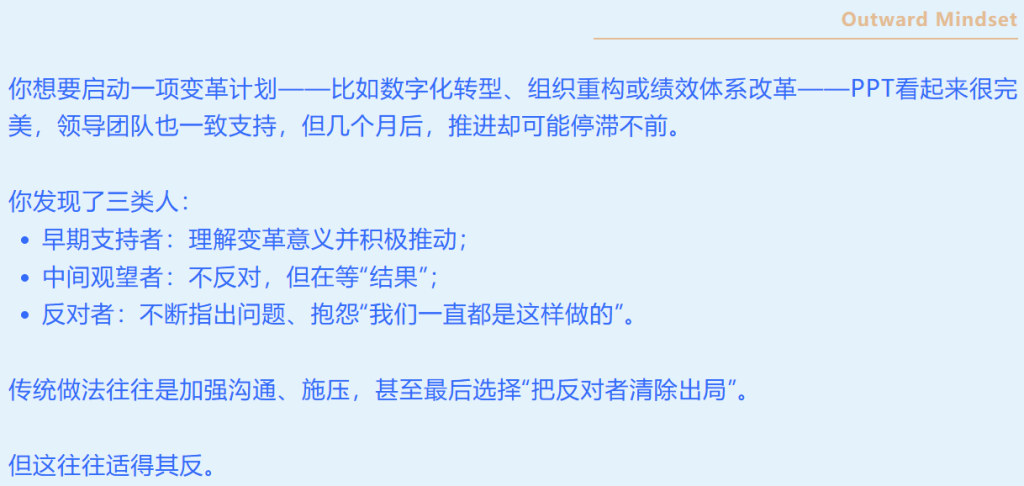 当我们遇到抵制时,我们的默认反应是片面脑设(Inward Mindset):把变革目标看成唯一重要的事,把推动变革视为自己必须赢的战役。