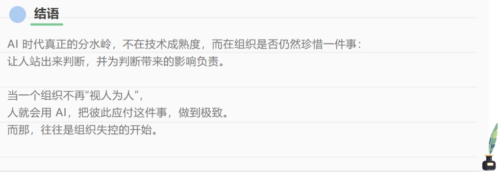 一旦组织默认:“人只需要完成接口,不需要真正理解”,AI 就会理所当然地接管一切。